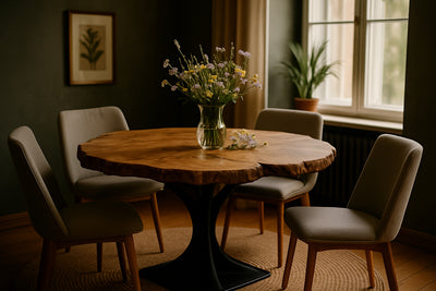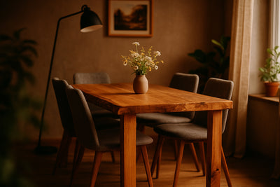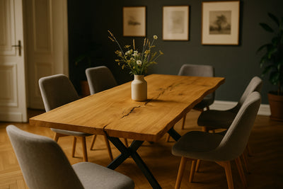 Ein Esstisch ist Mittelpunkt, Treffpunkt und Zuhause im Zuhause. Unsere Tische entstehen aus echtem Eichenholz – aus einem einzigen Stück. So wird jeder Tisch zu einem unverwechselbaren Unikat, mit natürlicher Maserung, warmer Haptik und einer Präsenz, die den Raum trägt.